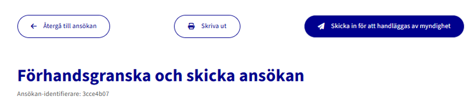 Om du vill skriva ut ansökan klickar du på Skriv ut. Välj slutligen knappen Skicka till myndighetsbehandling.