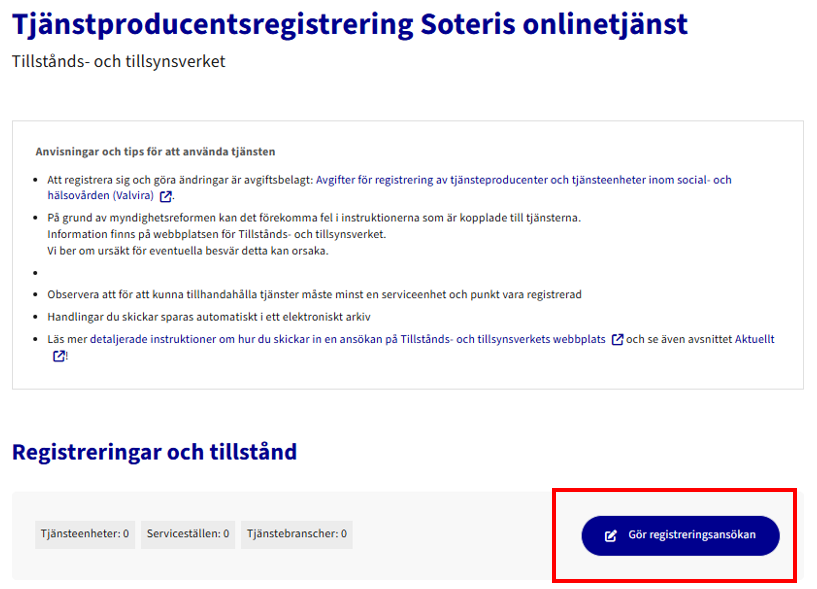 När du har registrerat dig som tjänsteproducent kan du samtidigt ansöka om registrering av en tjänsteenhet. Läs vår anvisning Registrering av tjänsteenhet.