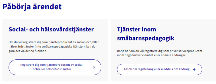 - Att enbart registrera sig som tjänsteproducent ger ännu inte rätt att producera tjänster inom social- och hälsovård.