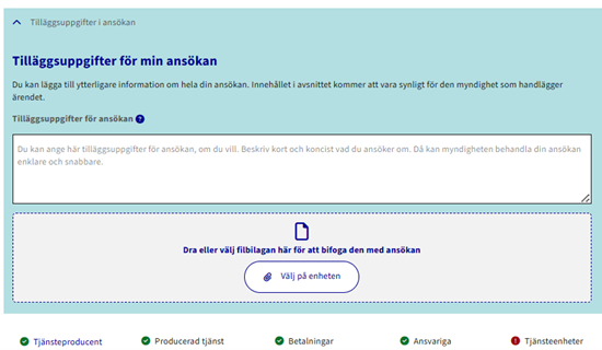 I rutan Tilläggsuppgifter i ansökan kan du ange tilläggsuppgifter gällande ansökan, om du vill. Beskriv samtidigt kort och koncist vad du ansöker om. Då kan myndigheten behandla din ansökan enklare och snabbare.